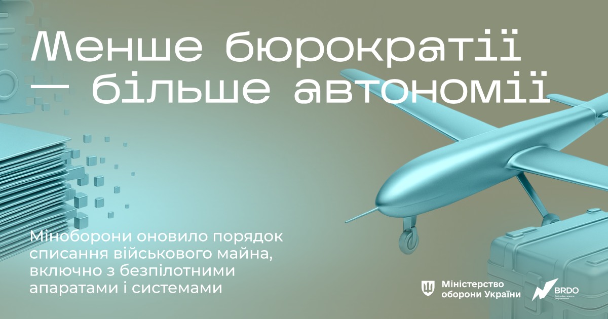 Міністерство оборони України спростило порядок списання військового майна з урахуванням процедур доукомплектування і розукомплектування безпілотних апаратів і систем. Зміни внесені до Порядку списання військового майна у ЗСУ та ДССТ (наказ № 81) для узгодження із Законом «Про правовий режим військового майна у Збройних Силах України». До підготовки цих змін долучилася команда BRDO.